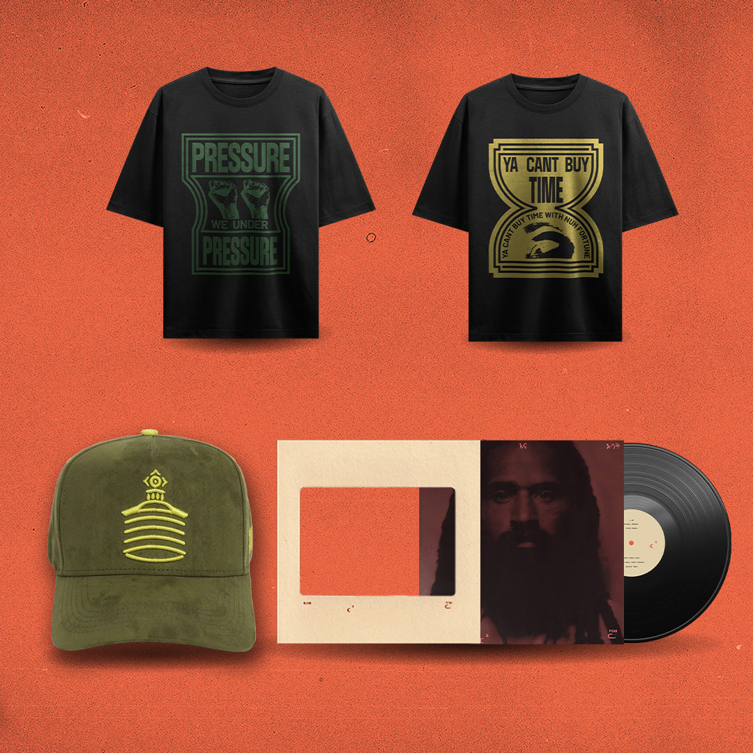 Born in Kingston, Jamaica, Keznamdi’s music and style embody resilience and self-determination. Bundle 4 includes BLXXD AND FYAH Vinyl, the Pressure Green T-shirt, Time Glass T-shirt, and the Crown Hat—each piece a symbol of the weight we live under and the unbreakable protest spirit to rise. A perfect mix of music and merch for the true fan ready to build their own path and take control of their destiny.